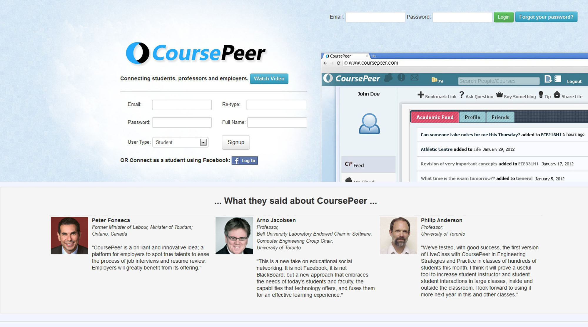 To date, CoursePeer has been piloted by key University of Toronto Faculty of Applied Science and Engineering members, including Professor Philip Anderson, Professor Khoman Phang and Prof. Arno Jacobsen, Bell University Laboratory Endowed Chair in Software and Chair, Computer Engineering Group. Professor Jacobsen, who has been working with CoursePeer says, "This is a new take on educational social networking. It is not Facebook, it is not BlackBoard, but a new approach that embraces the needs of today's students and faculty, the capabilities that technology offers, and fuses them for an effective learning experience."